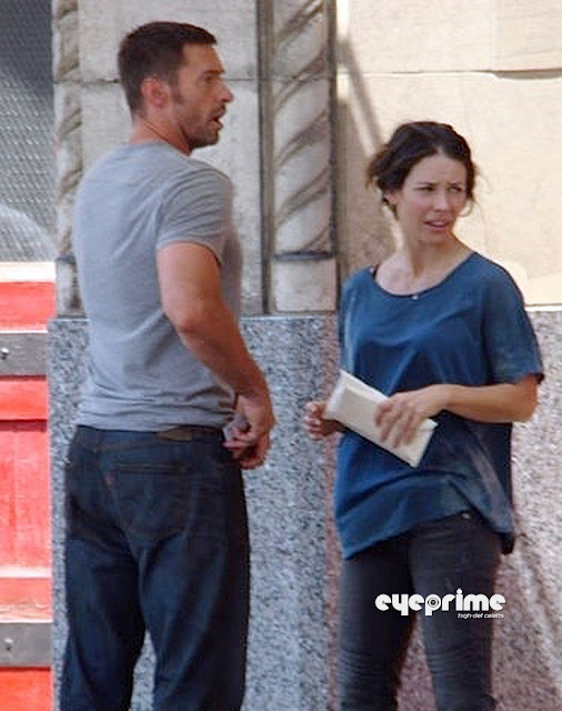 Hugh Jackman And Evangeline Lilly film scenes from their new movie 'Real Steel' outside of the Detroit Fire Department Headquarters in Detroit, MI, USA. 06/07/2010